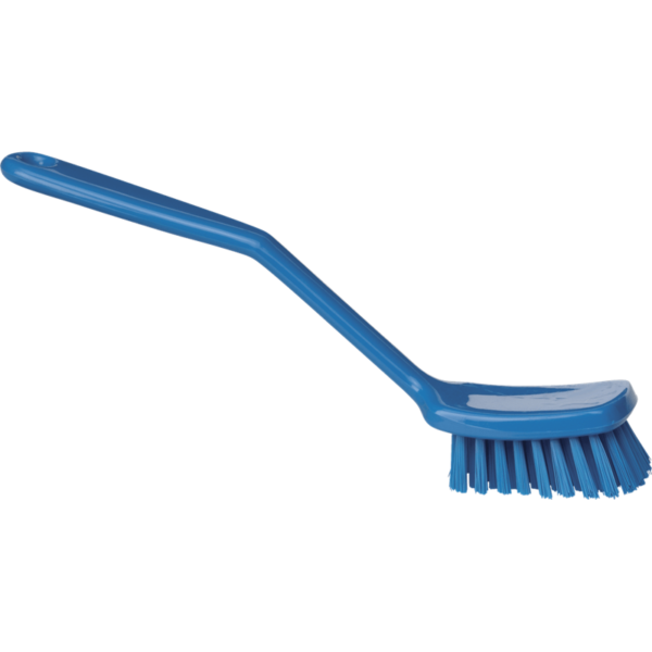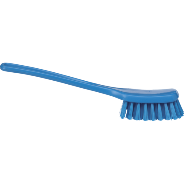 This small; light-weight brush has a broad head and an ergonomically angled handle. This design raises the user’s hand from the cleaning surface reducing the risk of injury. Used for cleaning small surface areas on production equipment; tables; etc.